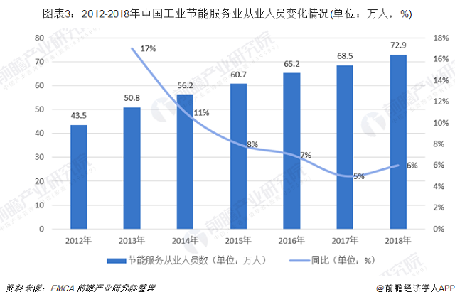 据中国节能协会节能服务产业委员会(EMCA)公布的统计数据显示,2012-2018年中国节能服务产业从业人员呈现上升趋势。2018年中国节能服务人员达到72.9万人,较2017年增长6%。节能服务产业作为朝阳行业,吸引着众多投资者和从业者。