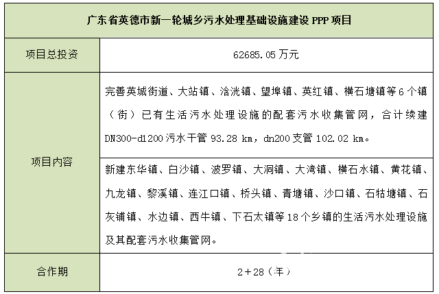广东省英德市新一轮城乡污水处理基础设施建设PPP项目