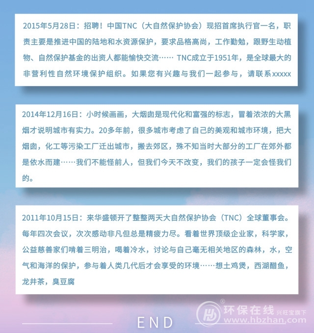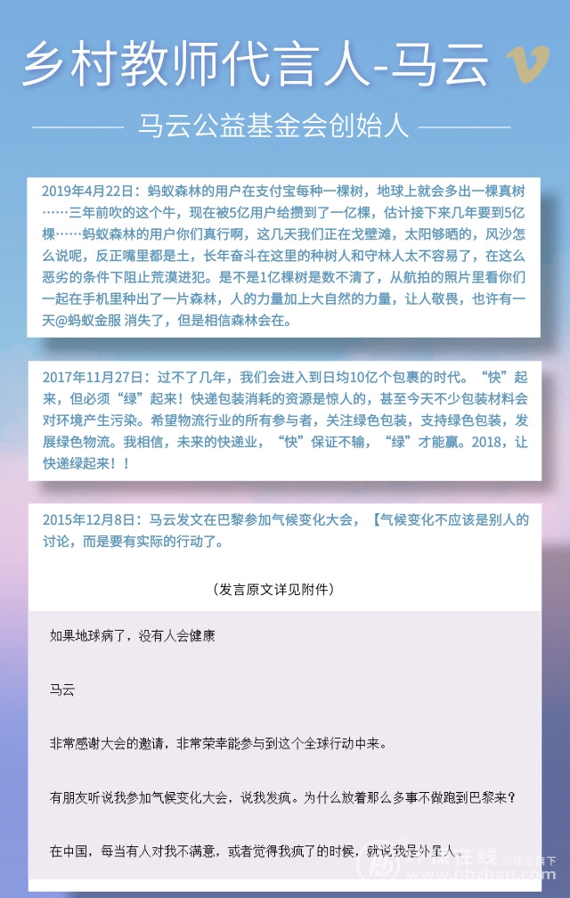 洋洋洒洒一篇,环保在线就划了一条重点:【阿里巴巴只是我很多梦想中的一个而已,我自己觉得我还很年轻,我自己觉得我有很多地方都想去玩玩、都想去折腾,很多事情像教育、公益、环保,这些我一直在做,但是我觉得我可以做的更好,花更多的时间,也许这是我应该做的事情。】